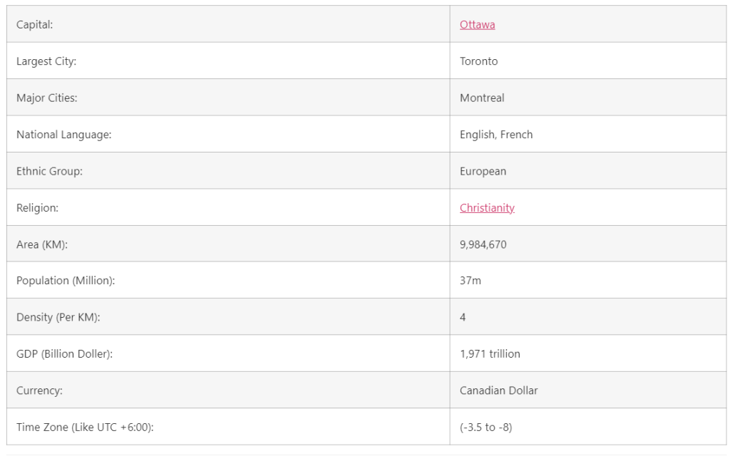 Canada is parliamentary democracy. It is one of highest ranked in international measurements of government transparency, quality of life, civil liberties, education, and economic. Due to large scale immigration it is also most ethnically diverse and multicultural nation. It is a developed country with very high GDP. Canada is member many important international organization including UN, NATO, G7, G20 and many more.