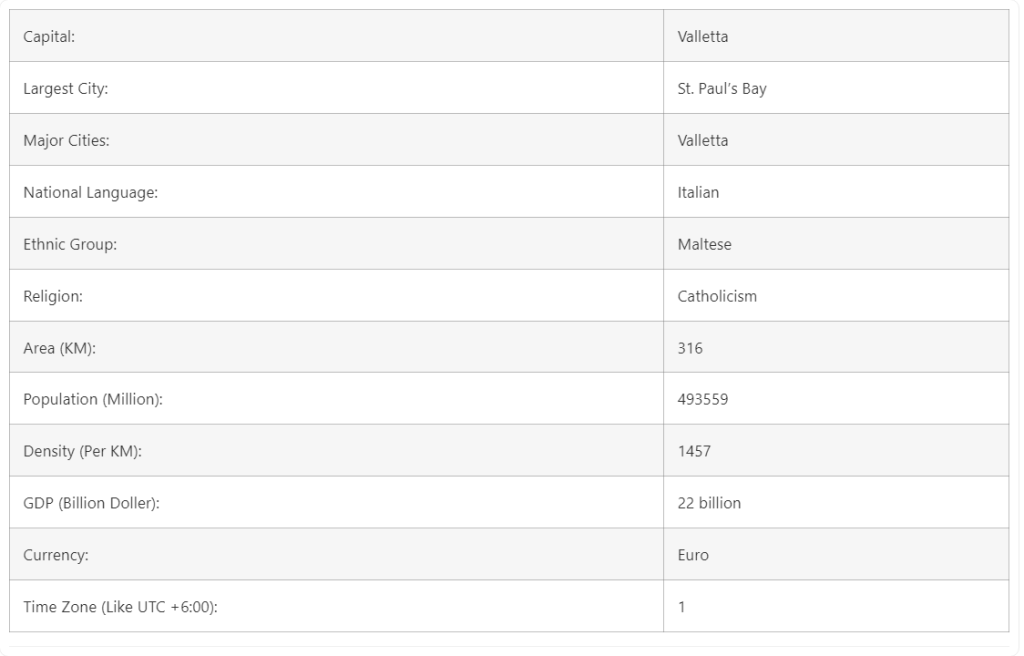 Malta is an island country in southern Europe in the middle of the Mediterranean Sea. Its situated 80 km south of Italy and 284 km east of Tunisia. It’s one of the smallest countries in Europe and in the world with a population of less than half a million. Due to the warm climate, it is a very popular destination for tourists.